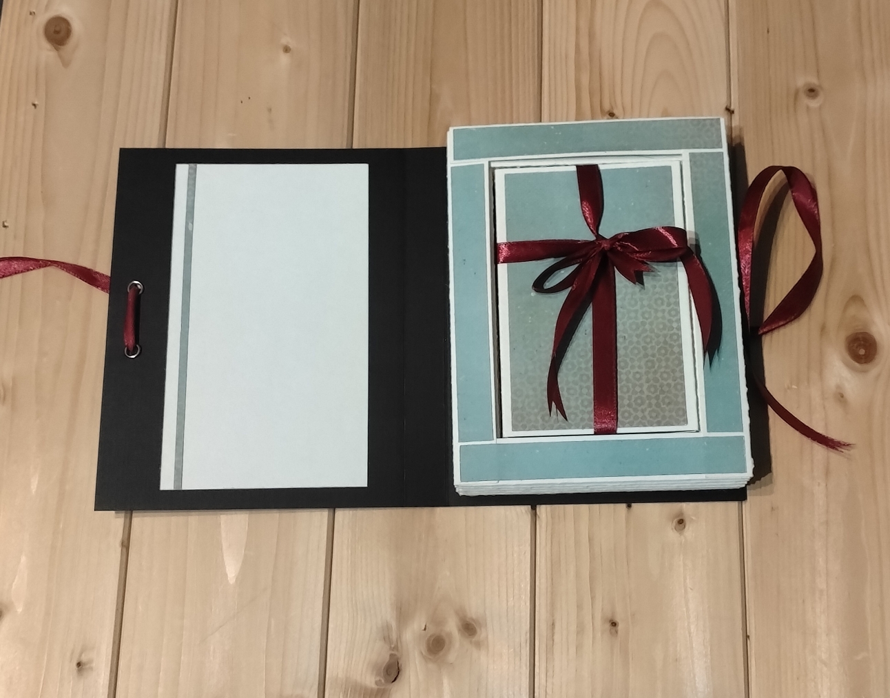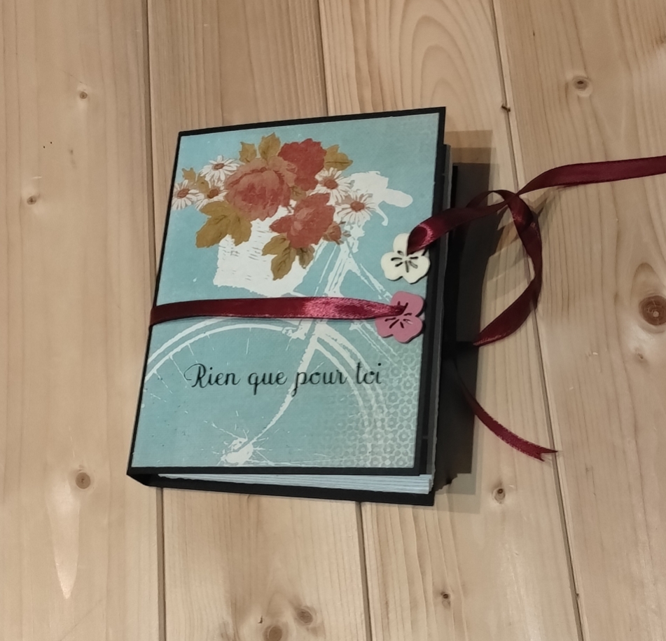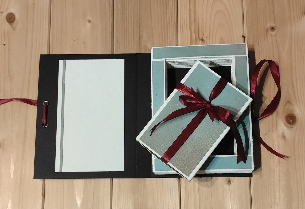 En effet, le bloc en accordéon donne l’illusion d’un livre. Mais lorsque l’on dénoue le ruban on découvre sur la page de gauche, un espace pour rédiger un petit message personnalisé. Sur la droite, au centre de cet accordéon, une petite boite cadeau, à l’intérieur de laquelle, on peut offrir une carte cadeau, de l’argent, un petit message empli d’amour ou d’amitié, ou encore un petit bijou.